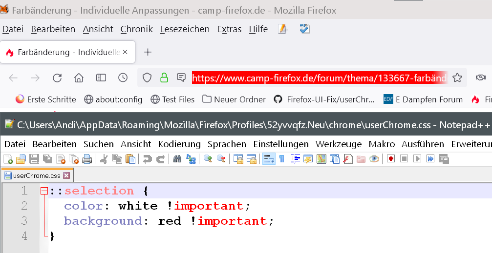 Ich habe das in die userChrome.css so eingtragen (die Datei hatte ich schon für eine andere Anpassung), aber es hat keine Wirkung, immer noch die selben Farben. Ich nutze Firefox im DarkMode und aktiviertem CompactMode, hat das vielleicht auch damit zu tun?