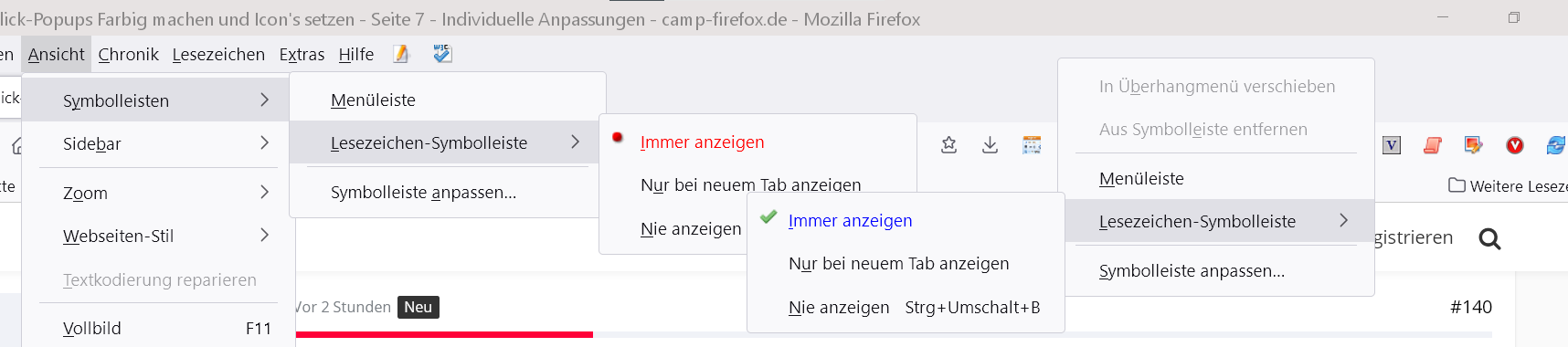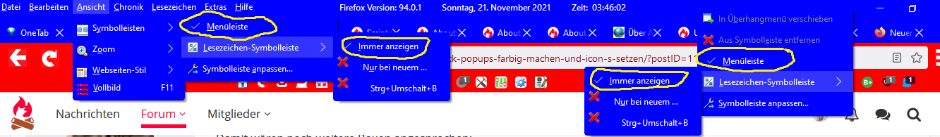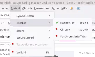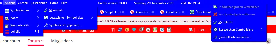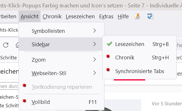 Im Bild sieht man: Menubar -> Ansicht -> Symbolleisten -> Menüleiste und ganz rechts Rechtsklick auf Menübar wieder Menüleiste. Meine Frage: Kann man das so machen, dass man für beide ein anderes Icon nehmen kann? Eigentlich will ich nur beide anders "Nennen" im "Ansicht.css" und im "Rechtsklick-Popups" :) Das gilt natürlich auch für die Anderen wo dort sind. Beispiel: Immer anzeigen. Lesezeichen-Symbolleiste oder Symbolleiste anpassen... usw...
