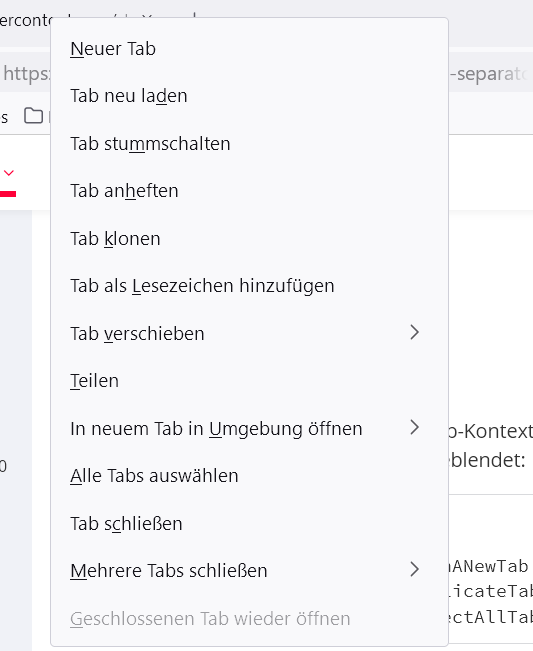 ich bekomme folgenden Separator im Tab-Kontextmenü einfach nicht weg. Ich benutze Simple Menu Wizard und habe damit die eigentlich drei vorhandenen Separator schon ausgeblendet: