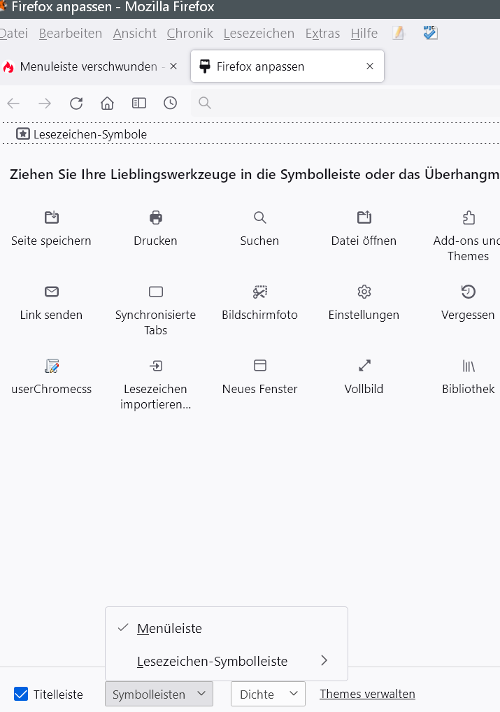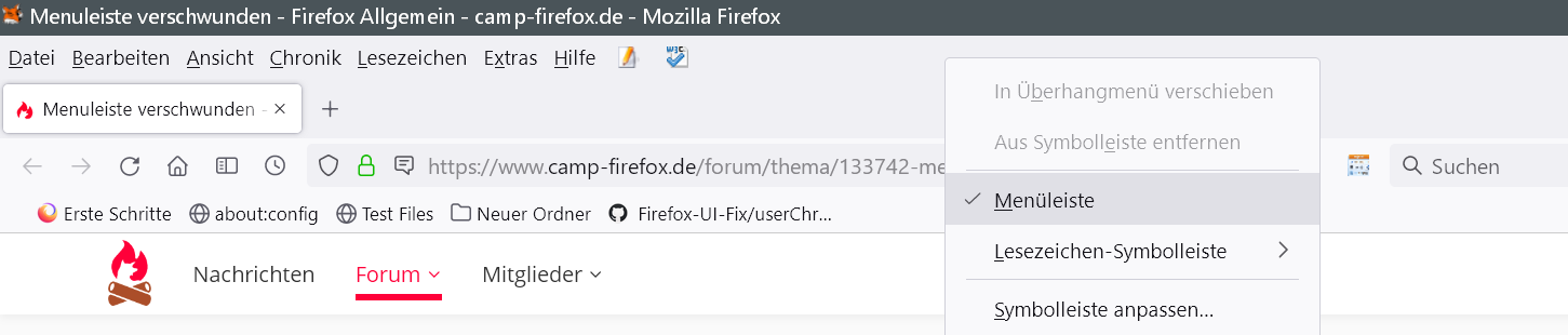 Die Menuleiste ist verschwunden, auch mit dieser Hilfe lässt sie sich nicht wiederfinden, die Angaben stimmen nicht mit dem Verhalten von Firefox überein.