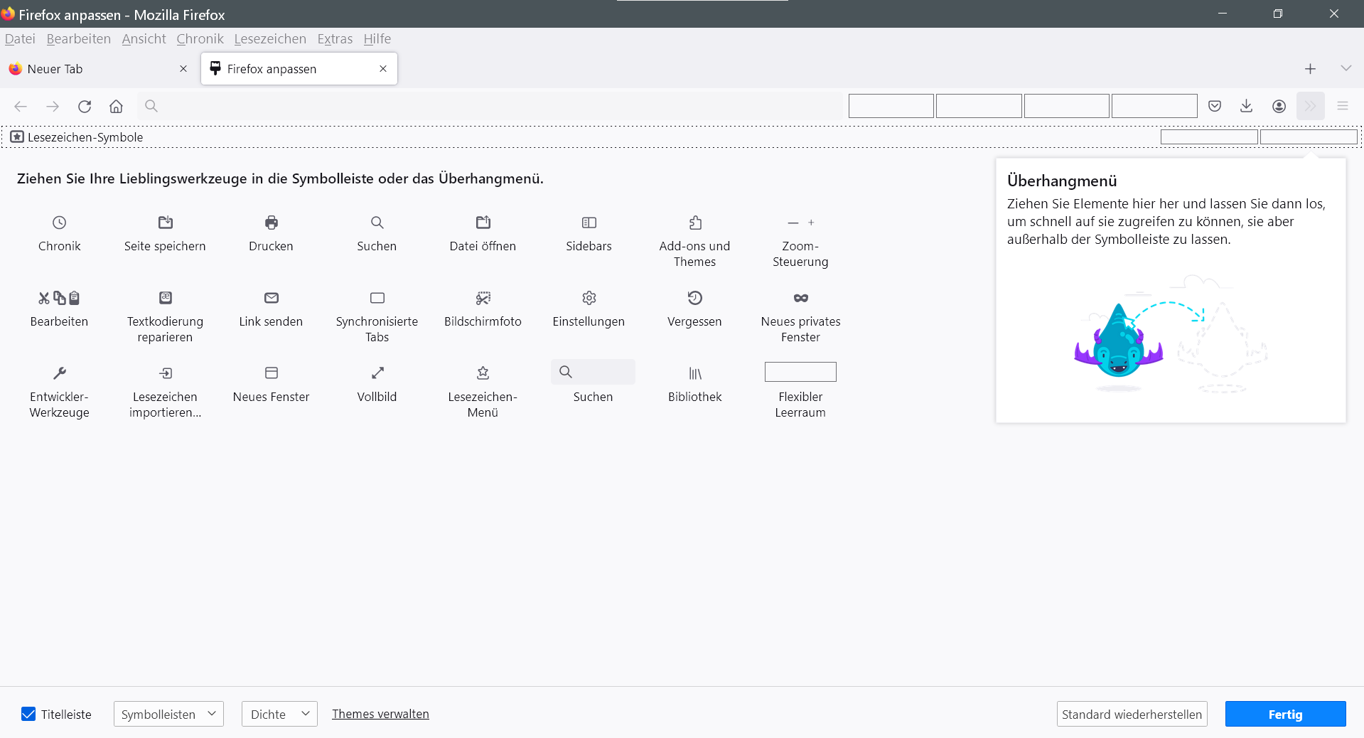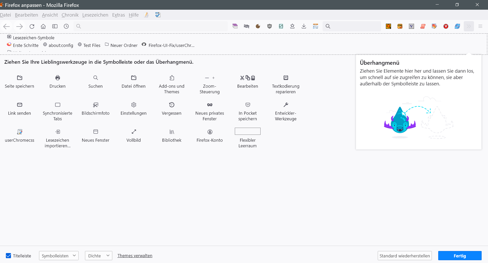 • Also ohne den Chrome Ordner funktioniert alles einwandfrei, sprich das Anpassen der Symbolleiste/Überhangmenü ist problemlos möglich.