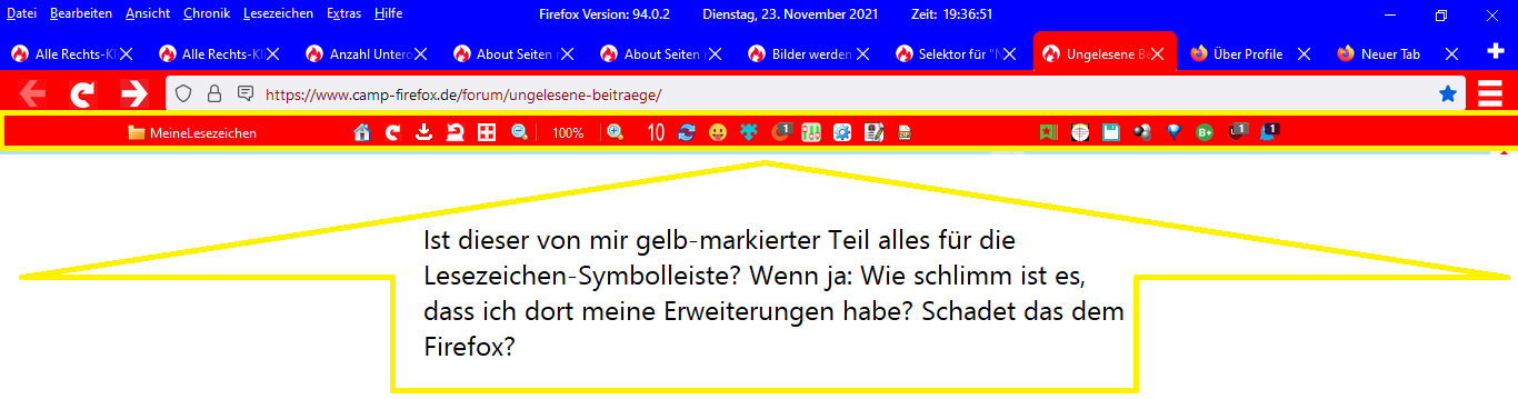 Ist dieser von mir gelb-markierter Teil alles für die Lesezeichen-Symbolleiste? Wenn ja: Wie schlimm ist es, dass ich dort meine Erweiterungen habe? Schadet das dem Firefox? Wenn ja: Kann ich unter der Adress-Leiste (URL-Bar) eine 2.te Zeile machen für nur die Icons von den Erweiterungen und Codes/Scripts? Dann kann ich die Lesezeichen-Symbolleiste freilassen oder ein Paar Lesezeichen-Ordner dort einfügen. Wobei ich diese lieber alle unter einem Ordner habe wie es jetzt ist. Besten Dank.
