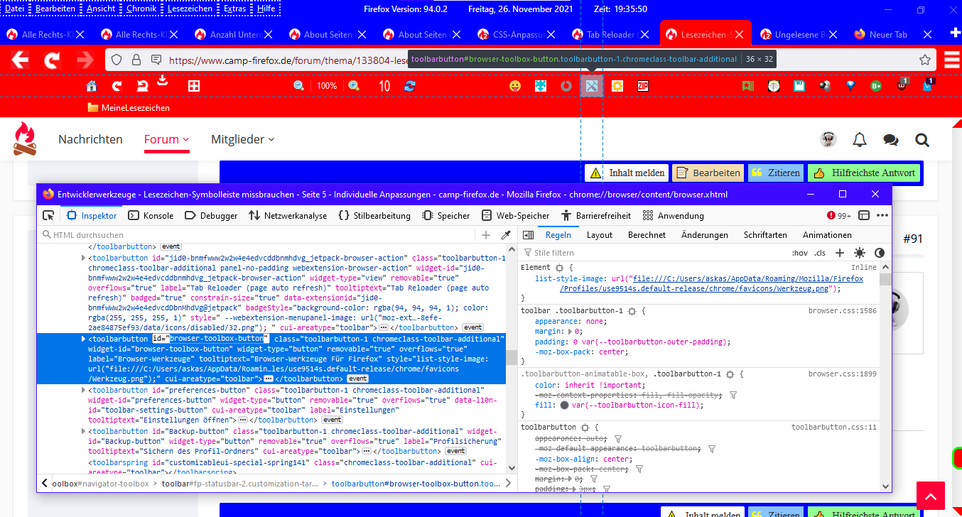 • Du hast auch Firefox neu gestartet und den Skript-Cache geleert? Mir ist, als hättest du das Symbol erst hinter dem Hilfe-Menü, also einen anderen Wert für warpmenuto:. Ach nein, war in einem Beitrag von Andreas.