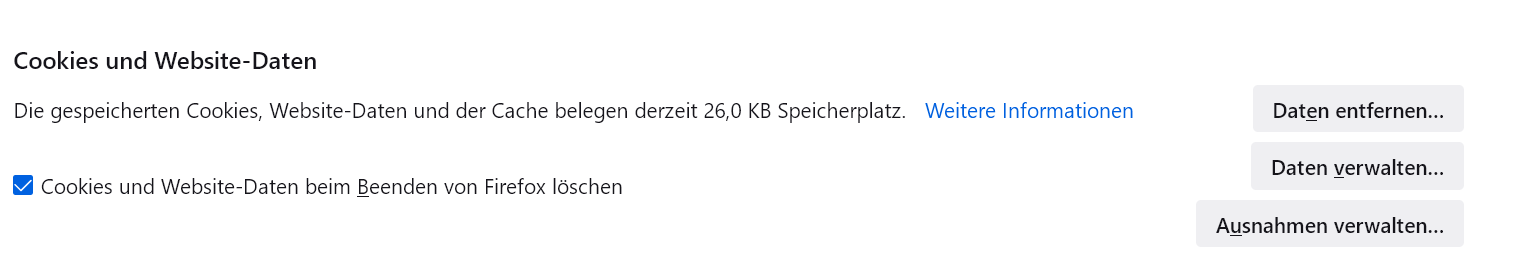 Nach jedem Firefox-Neustart muß man zum Aufruf einer Website sein Einverständnis zu Cookies und den Zugangsdaten geben. Das mag aus Sicherheitsgründen berechtigt sein, kann aber auch sehr lästig sein.