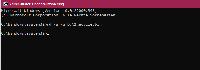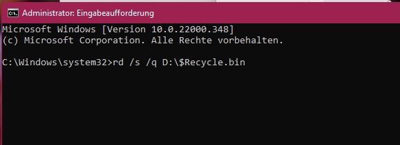 2. dann habe ich: rd /s /q D:\$Recycle.bin eingegeben und auf 'Enter' gedrückt: