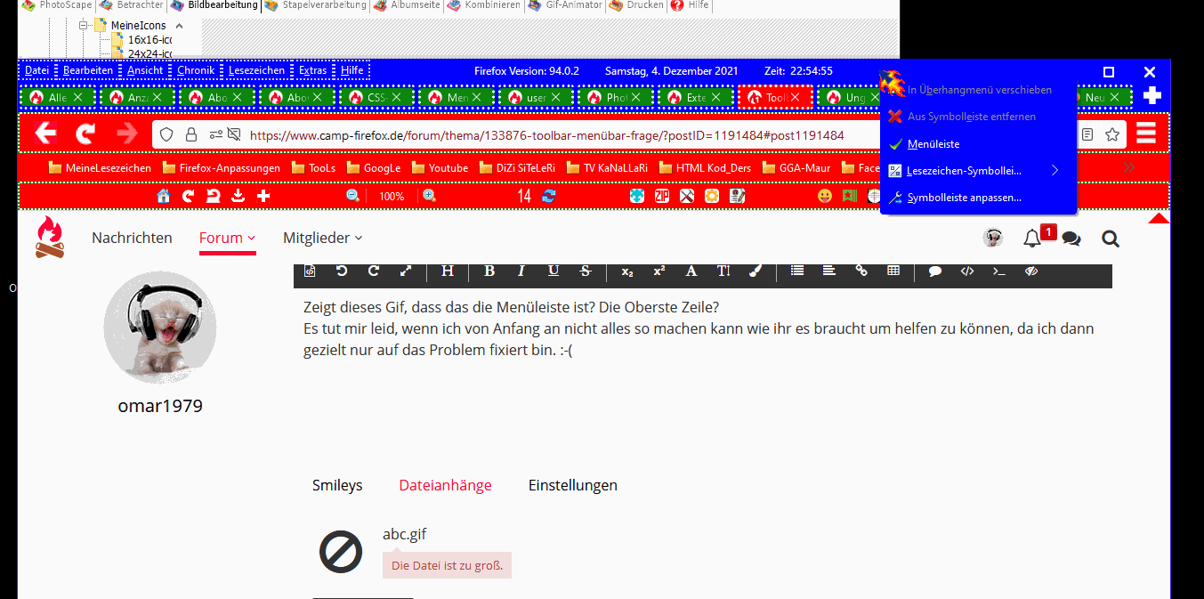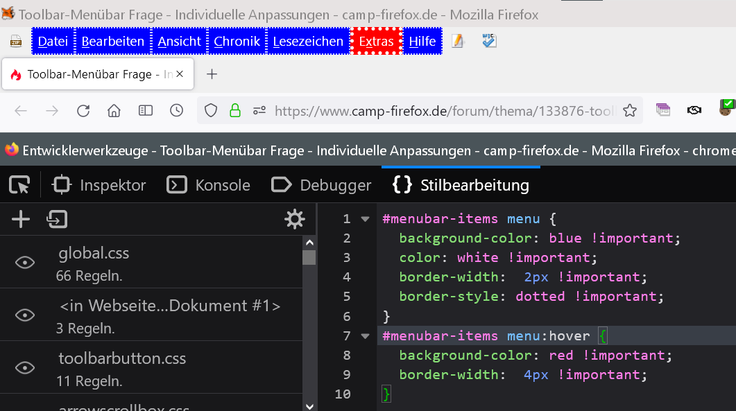 Alles anzeigenmenu[id="file-menu"], menu[id="edit-menu"], menu[id="view-menu"], menu[id="history-menu"], menu[id="bookmarksMenu"], menu[id="tools-menu"], menu[id="helpMenu"] { background-color: blue !important; color: white !important; border-width: 2px !important; border-style: dotted !important; } menu[id="file-menu"]:hover, menu[id="edit-menu"]:hover, menu[id="view-menu"]:hover, menu[id="history-menu"]:hover, menu[id="bookmarksMenu"]:hover, menu[id="tools-menu"]:hover, menu[id="helpMenu"]:hover { background-color: red !important; border-width: 4px !important; }Und ich hatte schon mal empfohlen, alle Leisten in ein separates CSS zu verteilen zwecks Fehlersuche. Da steht wieder 3in1, die erstmal nichts miteinander gemeinsam haben.