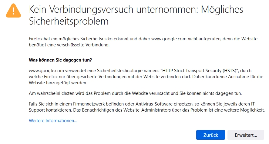 Es öffnet sich ein Fenster: Kein Verbindungsversuch unternommen: Mögliches Sicherheitsproblem, Firefox hat ein mögliches Sicherheitsrisiko erkannt und daher http://www.google.de nicht aufgerufen, denn die Website benötigt eine verschlüsselte Verbindung..... http://www.google.de verwendet eine Sicherheitstechnologie namens "HTTP Strict Transport Security (HSTS)", durch welche Firefox nur über gesicherte Verbindungen mit der Website verbinden darf. Daher kann keine Ausnahme für die Website hinzugefügt werden.