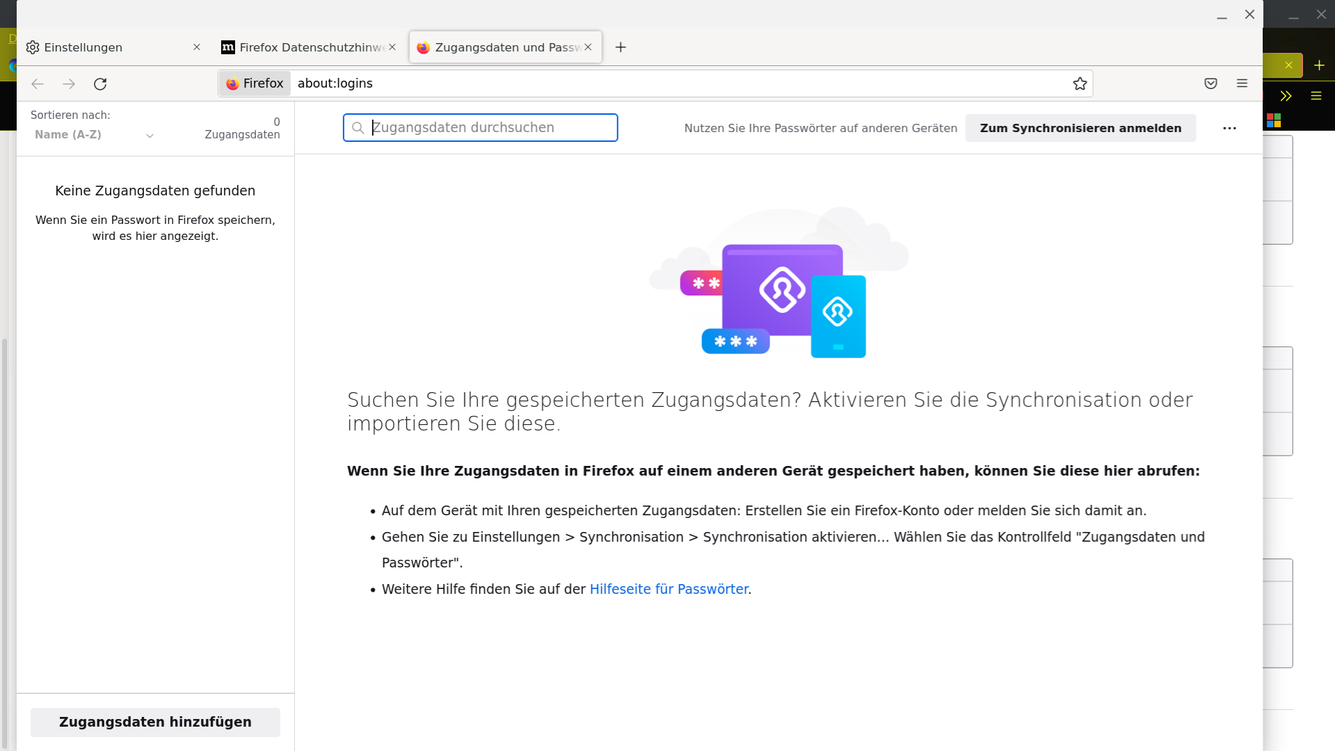 Beim Update auf Firefox 95.0 sind meine gesamten Zugangsdaten verschwunden? Habe noch ein zweites Profil gefunden, dieses hat diese Zugangsdaten aber auch nicht. Werde nun immerzu auf eine App Lockwise weitergeleitet, dafür benötige ich aber ein Passwort - welches ich angeblich vor mehreren Monaten schon vergeben hätte, aber nicht habe.
