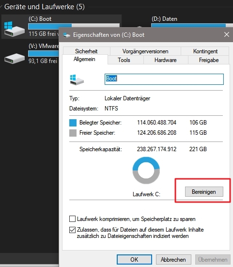 ... die windowseigene Datenträgerbereinigung. Rechtsklick auf das Laufwerk > Eigenschaften > Bereinigen und dann entsprechende Option auswählen.