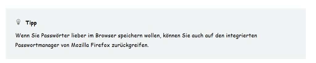 • Außerdem habe ich immer wieder gelesen, dass man auf keinen Fall den internen Passwort-Manager eines Browsers nutzen soll.