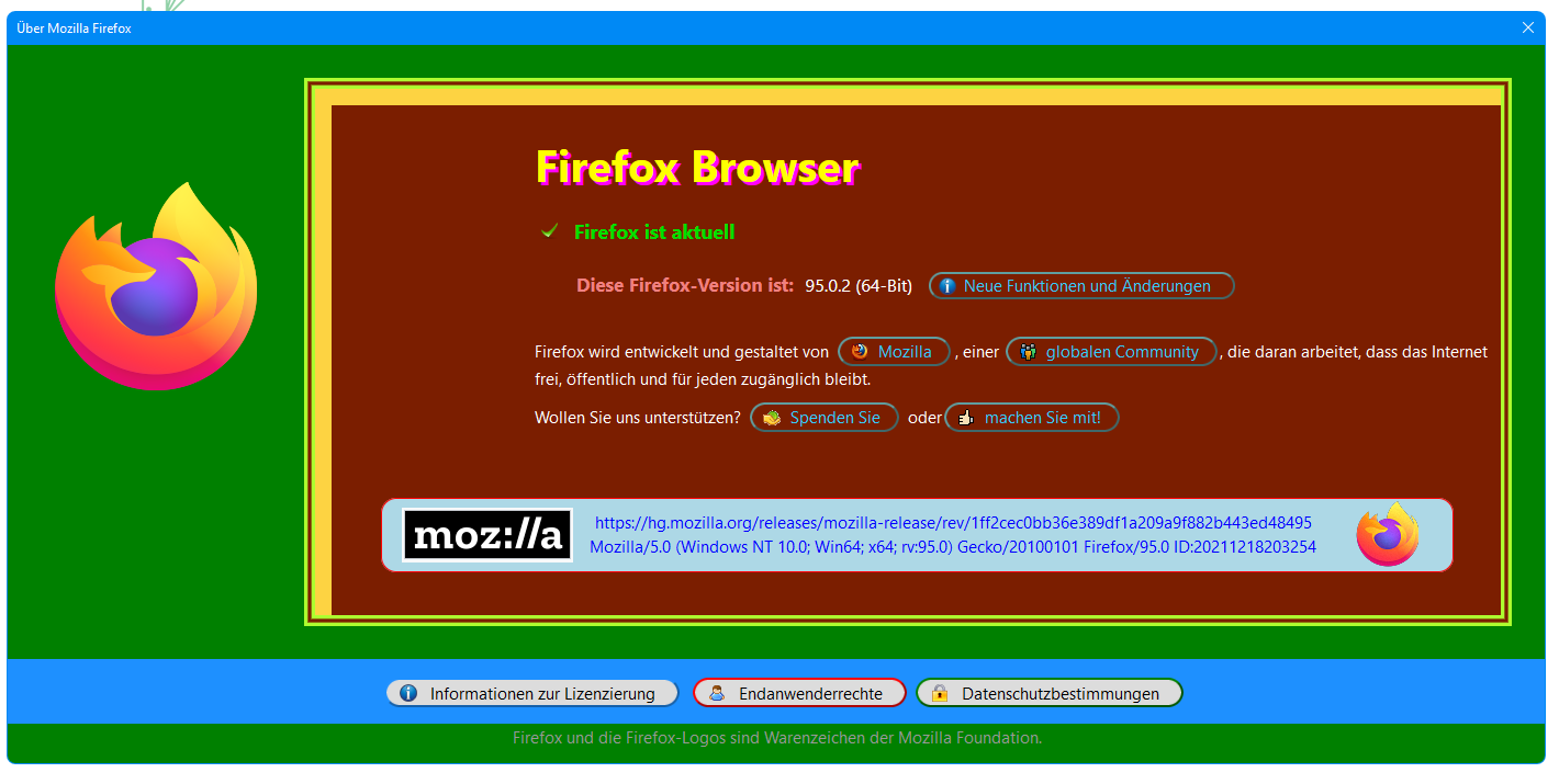 Alles anzeigen/* About : Dialog */ @-moz-document url-prefix("chrome://browser/content/aboutDialog.xhtml") { #aboutDialog vbox, #aboutDialogContainer hbox, #clientBox vbox, #contributeDesc > label:nth-child(1), #contributeDesc > label:nth-child(2), #releasenotes, #trademark, #updateButton, label.bottom-link:nth-child(3), [href='about:credits'], [href='about:license'], [href='about:rights'], [href='https://www.mozilla.org/?utm_source=firefox-browser&utm_medium=firefox-desktop&utm_campaign=about-dialog'] { font-size: 15px !important; } /* ohne Unterstrich */ #contributeDesc > label:nth-child(1), #contributeDesc > label:nth-child(2), #releasenotes, label.bottom-link:nth-child(3), [href='about:credits'], [href='about:license'], [href='about:rights'], [href='https://www.mozilla.org/?utm_source=firefox-browser&utm_medium=firefox-desktop&utm_campaign=about-dialog'] { text-decoration: none !important; } #aboutDialog, #aboutDialogContainer, #clientBox, #trademark { background-color: green !important; } /* Box ganz unten mit den drei Button */ #bottomBox { background-color: dodgerblue !important; } #aboutDialog { margin-bottom: 6px !important; } #version:before { content: 'Diese Firefox-Version ist: '; font-size: 17px !important; font-weight: bold !important; color: #f08080 !important; margin-right: 6px !important; margin-left: 12px !important; } #version { font-size: 16px !important; margin-top: 30px !important; color: #fff !important; } #aboutDialog { height: 350px !important; min-width: 1400px !important; } #agent { appearance: none !important; margin: 50px 40px 84px 10px !important; max-height: 56px !important; padding-top: 5px !important; text-align: center !important; border-radius: 14px !important; max-width: 1100px !important; } #agent .textbox-input-box { margin-top: -1px !important; margin-left: 12px !important; } #bottomBox { margin-bottom: 30px !important; margin-top: 15px !important; } #updateBox > vbox:nth-child(2) > hbox:nth-child(2) { margin-top: -25px !important; margin-bottom: 20px !important; } #trademark { margin-top: 16px !important; margin-bottom: -40px !important; } #leftBox { margin-top: 60px !important; } #rightBox { background: #7b1e00 /* #003bed */ !important; padding-left: 200px !important; padding-bottom: 6px !important; border-color: greenyellow !important; border-style: double !important; border-width: 10px !important; box-shadow: 15px 15px 0px 0px #fdd342 inset !important; } #rightBox::before { content: "Firefox Browser" !important; font-size: 40px !important; font-weight: 700 !important; color: yellow !important; text-shadow: 4px 4px magenta !important; } /* in Verbindung mit Script DialogBox.uc.js für große Text-Box */ #agent, #rightBox textarea { appearance: none !important; min-width: 850px !important; background: lightblue url("file:///C:/FoxIcons/Bild213.png") no-repeat !important; /* Icon linke Seite */ background-position:18px 8px !important; color: blue !important; text-align: center !important; margin-top: 50px !important; margin-bottom: 10px !important; margin-left: -140px !important; border: 1px solid red !important; padding: 10px 30px 0 95px !important; } #rightBox::after { content: "" !important; appearance: none !important; background: url("file:///C:/FoxIcons/Bild214.png") no-repeat !important; /* Icon rechte Seite */ margin-left: 745px !important; padding-top: 77px !important; padding-right: 60px !important; } /* Text-Box ** ENDE */ #icons > .icon { margin-top: 23px !important; } /* Firefox ist aktuell */ label[data-l10n-id="update-noUpdatesFound"] { color: #00e000 !important; font-weight: 700 !important; font-size: 1.2em !important; margin-left: 10px !important; margin-top: 20px !important; margin-bottom: 15px !important; } /* grüner Haken als Icon eingefügt */ #icons > .noUpdatesFound { fill: transparent !important; /* Original ausgeblendet */ background-image: url("file:///C:/FoxIcons/Bild62.png") !important; background-repeat: no-repeat !important; } /* Update-Suche */ label[data-l10n-id="update-checkingForUpdates"] { color: gold !important; font-weight: 600 !important; font-size: 1.2em !important; margin-left: 10px !important; margin-bottom: 15px !important; margin-top: 20px !important; } #downloadAndInstallButton { appearance:none !important; fill: transparent !important; background: #fef6f9 url("file:///C:/FoxIcons/Bild210.png") no-repeat !important; padding-top: 3px !important; padding-bottom: 3px !important; padding-left:30px !important; padding-right: 14px !important; background-position:6px 5px !important; font-size:13.5px !important; border-radius:14px !important; border-left-color: #FFB2B2 !important; border-top-color: #FFB2B2 !important; border-right-color: lightblue !important; border-bottom-color: lightblue !important; border-style:outset !important; border-width:2px !important; color:red !important; margin-left: 10px !important; margin-bottom: 15px !important; margin-top: 20px !important; } #downloadAndInstallButton:hover { appearance:none !important; background: #B2EDFA url("file:///C:/FoxIcons/Bild210.png") no-repeat !important; background-position:6px 5px !important; color:black !important; } #updateButton { appearance: none !important; background: gainsboro url("file:///C:/FoxIcons/Bild212.png") no-repeat !important; min-width: 360px !important; padding-left: 30px !important; background-position: 11px 4px !important; border-radius: 14px !important; border-color: red !important; border-style: outset !important; border-width: 2px !important; color: black !important; margin-left: 10px !important; margin-bottom: 15px !important; margin-top: 20px !important; } #updateButton:hover { appearance: none !important; background: #b2edfa url("file:///C:/FoxIcons/Bild212.png") no-repeat !important; padding-left: 30px !important ; background-position: 11px 4px !important; } #updateButton .button-box { padding-top: 0 !important; padding-bottom: 0 !important; -moz-padding-start: 3px !important; -moz-padding-end: 3px !important; } #updateBox 