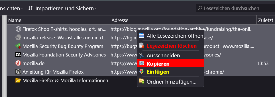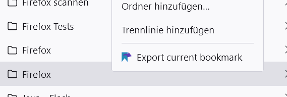 @oldman53 - Danke! Ich habe das AddOn installiert aber wenn ich den gewünschten Ordner rechts anclicke kommt nicht Export current Bookmark sondern ein Menü mit "Seite speichern unter - Alles auswählen - Bildschirmfoto aufnehmen - Seitenquelltext anzeigen - Barierefreiheit - Untersuchen - Single File".