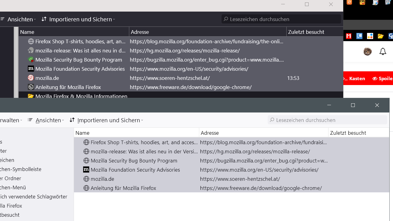 • Über Exportieren/Importieren gelingen mir nur ALLE Lesezeichen Ordner gemeinsam zu transferieren.