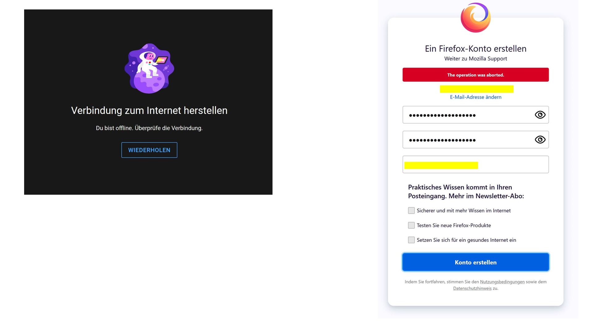 Heute war es natürlich krass. Ich wollte mich zur Firefox-Hilfe anmelden und nach Eingabe meiner Daten konnte ich die Anmeldung nicht abschließen. Siehe Anhang