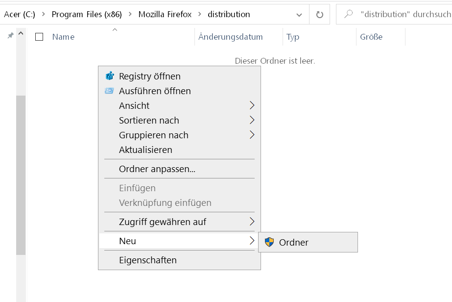 Und zwar im Installationsordner vom Fx den Ordner distribution neu erstellen, und in ihm dann eine policies.json Datei.