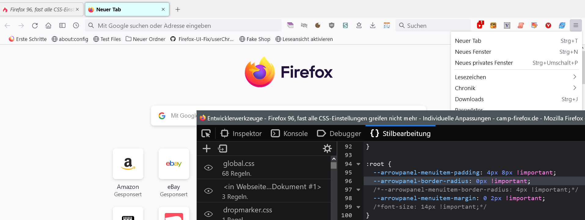 Seit dem Update auf die Version 96 funktionieren fast alle meine userChrome Einstellungen nicht mehr.