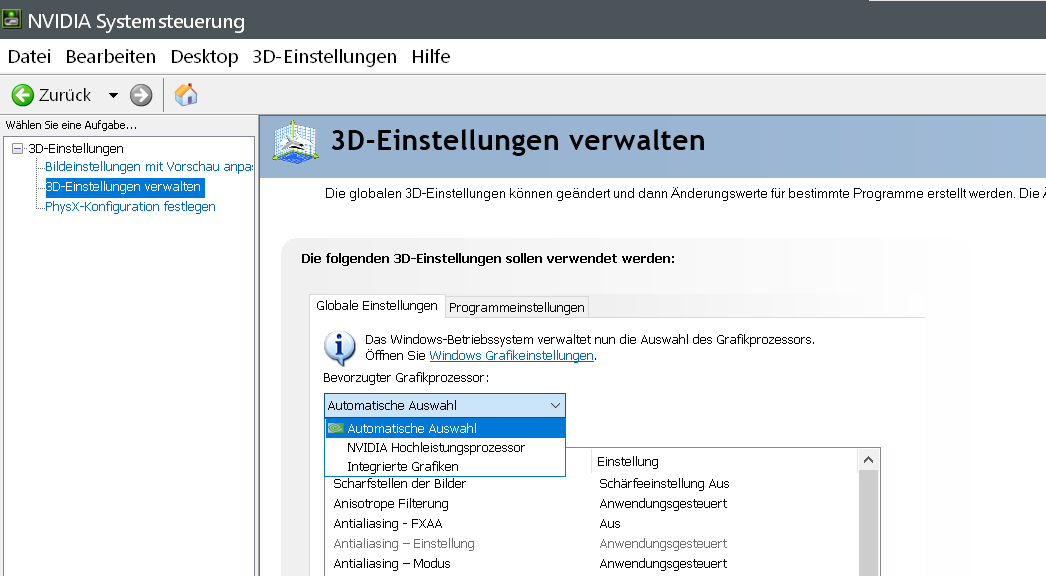 • Habe nun in den NIVIDA 3D Einstellungen wieder zurück auf "Hochleistungsprozzesor" eingestellt, und alles läuft wieder prima!