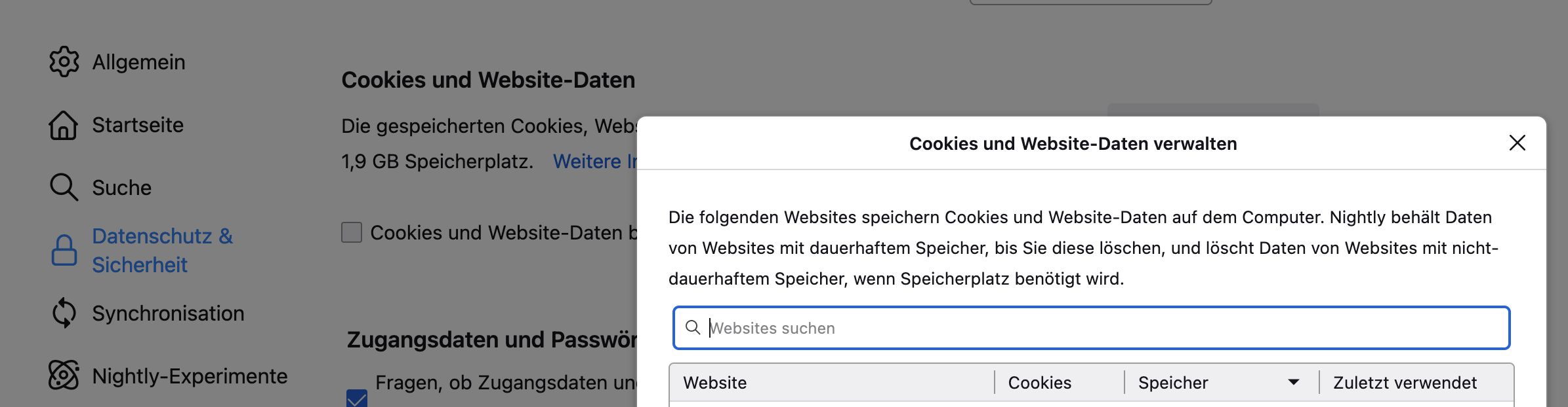 Der Profilordner enthält im Ordner "storage" weitere Unterordner, die Namen von Websites haben, z. B. "https+++http://www.mozilla". Einen Unterordner mit dem Namen der Website, deren Cookie-Speicher ich suche, gibt es nicht.