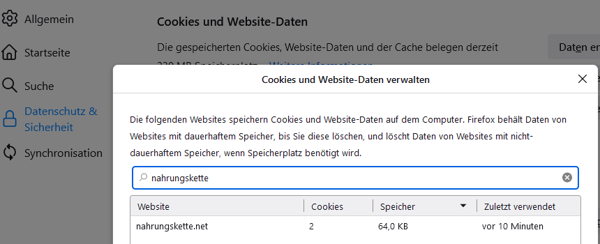 Nachdem ich cookies.sqlite gelöscht habe und Firefox die Datei neu angelegt hat, waren die Cookies der Website immer noch in Firefox unter "Datenschutz & Sicherheit" > "Cookies und Website-Daten" zu sehen. Wenn ich die Website aufrufe, bin ich dort weiterhin angemeldet, auch nach Aktualisieren der Website.