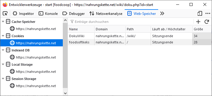 Ich kann die 2 Cookies und auch deren Inhalt im Web-Speicher-Inspektor von Firefox sehen (öffnen mit Umschalttaste+F9, zuvor Website aufrufen). Dennoch würde ich gerne wissen, wo genau diese Cookies gespeichert sind.