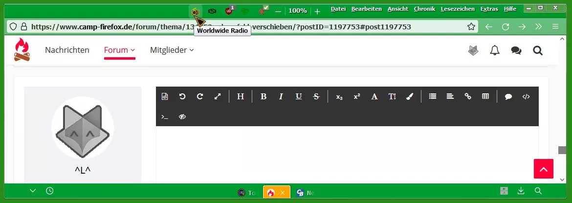 Bevor ich allerdings überhaupt an Anpassung denken kann, muss ein grundsätzliches Problem gelöst werden, nämlich dass bei jedem zweiten Versuch Firefox zu starten der Browser hängen bleibt, sprich, das Icon wird in der Taskleiste angezeigt, der Browser öffnet sich aber nicht wirklich und muss über den Taskmanager abgewürgt werden. Beim zweiten Start wird der Browser normal geöffnet. Schließt man ihn dann wieder und versucht ihn erneut zu öffnen, gibt's wieder das oben beschriebene Problem.