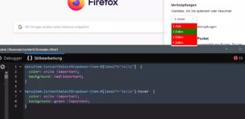 CSS#ContentSelectDropdown > menupopup > menuitem:hover { background: green !important; color: white !important; } #ContentSelectDropdown > menupopup::part(arrowscrollbox) { background: red !important; color: white !important; }Der Code ist für die userChromeShadow.css