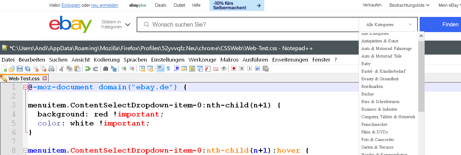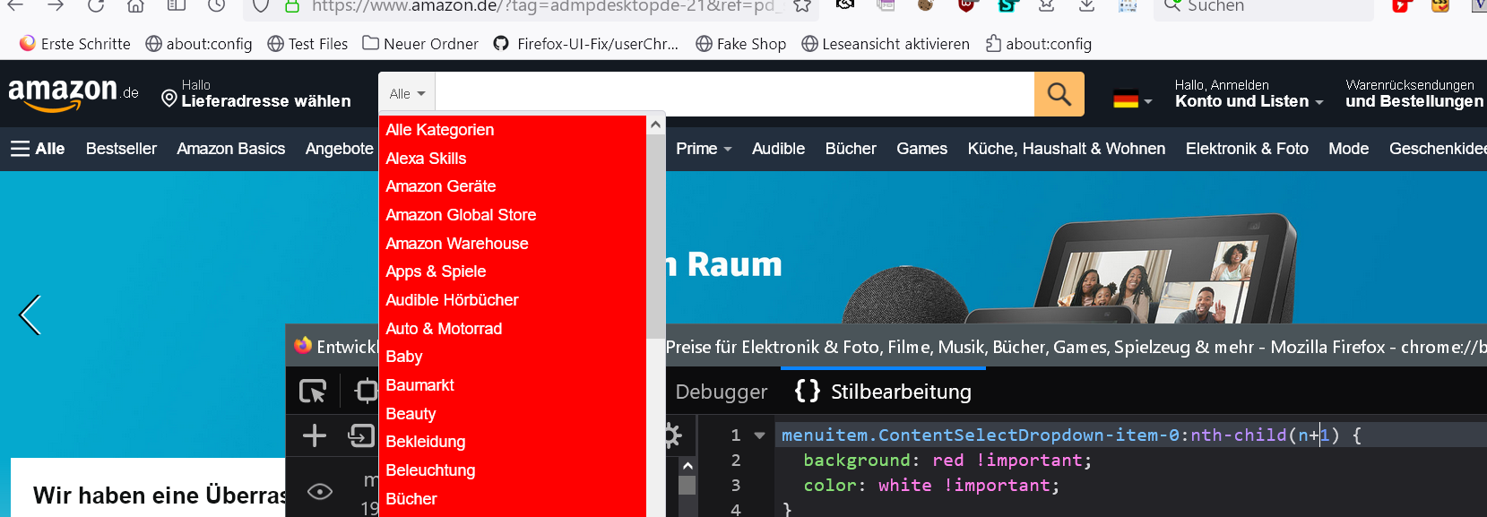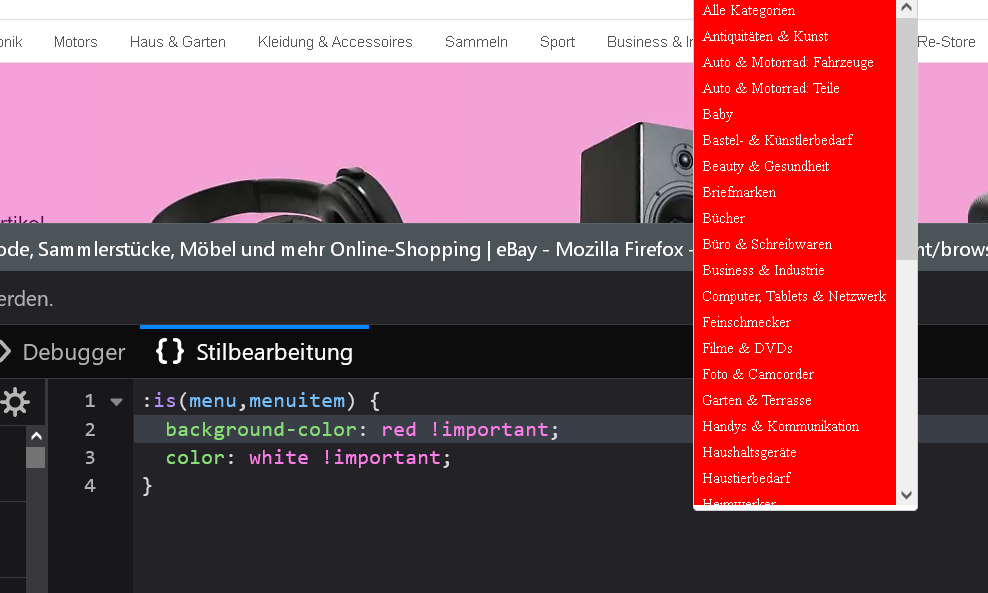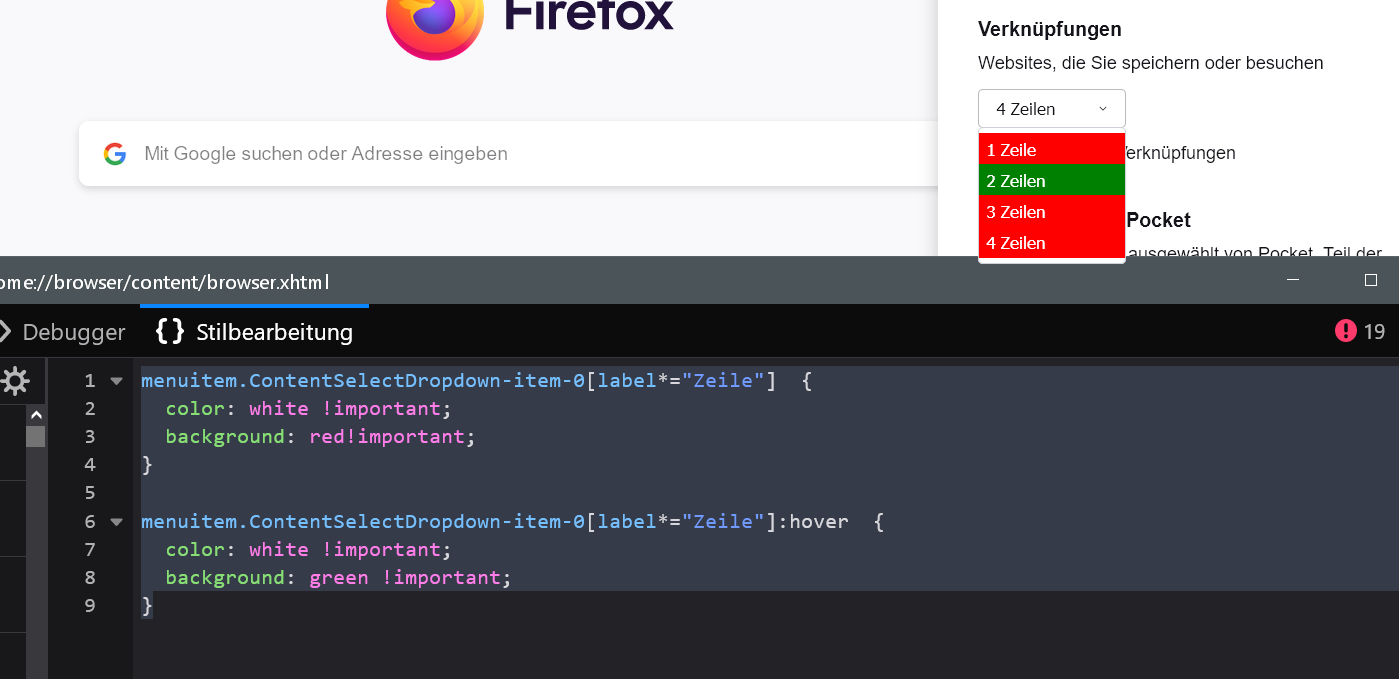 Alles anzeigen#ContentSelectDropdown > menupopup > menucaption, #ContentSelectDropdown > menupopup > menuitem { padding-inline-start: 0px !important; color: black !important; background-color: white !important; min-height: 20px !important; max-height: 20px !important; } #ContentSelectDropdown > menupopup > menucaption:hover, #ContentSelectDropdown > menupopup > menuitem:hover { color: red !important; background: lightblue !important; }mit dem ich auf ebay und amazon genau das verhinder !