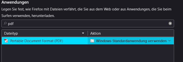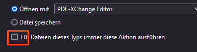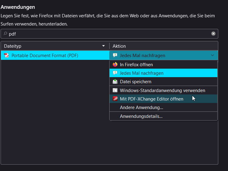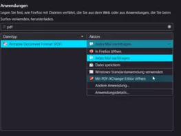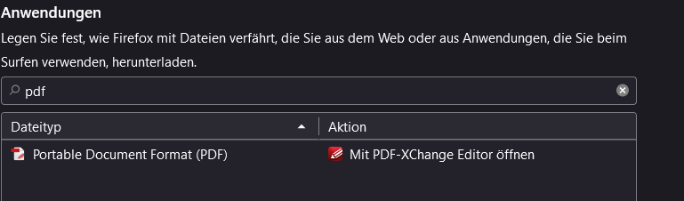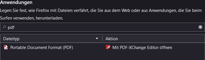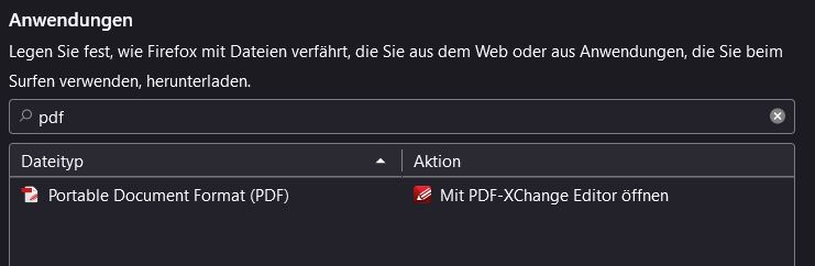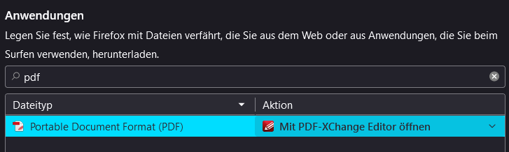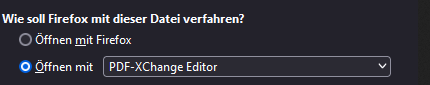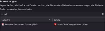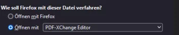 Im Firefox wurde auch der PDF-XChange-Editor ausgewählt als App zum Öffnen von PDFs