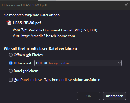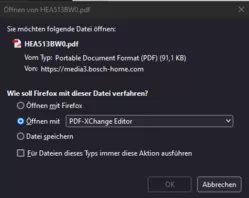 Hier muss ich zwar "Windows-Standardprogramm..." auswählen in Firefox, aber das ist egal, weil sich der Betrachter mit einem PDF von Bosch öffnet.