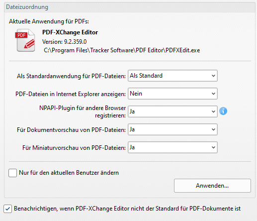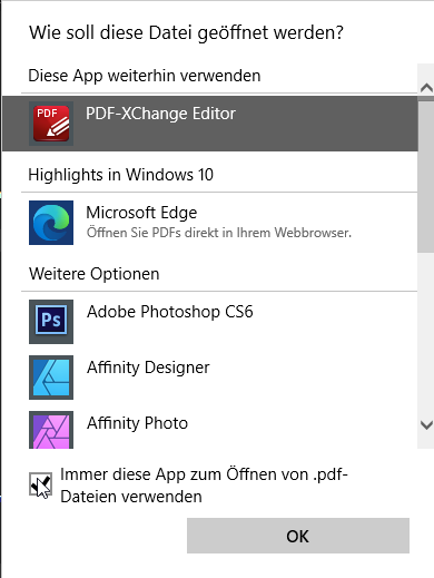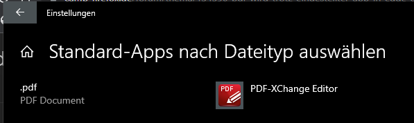 Und das funktioniert auch unter Windows. Win10 öffnet bei Doppelklick auf ein PDF immer den PDF-XChange Editor ohne nachzufragen