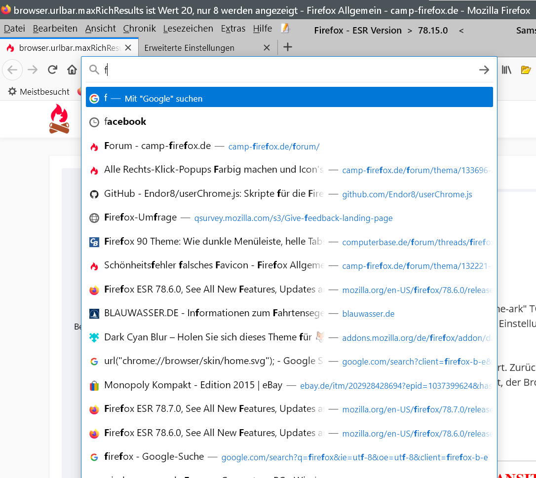 Steht mal wieder alles im Betreff. Ich halte mein "state-of-the-ark" TOSHIBA-Satellite mit o.g. Linux-Distribution am Laufen. Gerade fiel mir dann auf - weiss leider nicht seit wann es so geht - dass die Einstellung browser.urlbar.maxRichResults nicht mehr so funktioniert, wie sie soll...