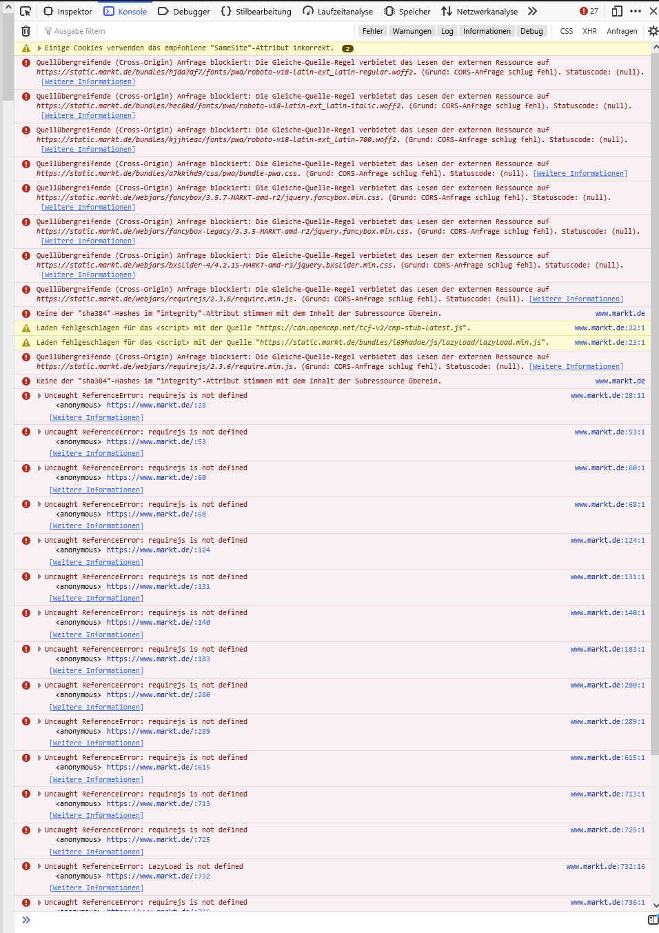 Das sieht auch so im Abgesicherten Modus aus und auch mein Test mit dem MS Edge 99 liefert das gleiche Ergebnis. Wie lange das schon so aussieht, kann ich nicht sagen, bin seit Längerem nicht auf der Seite gewesen. In der Konsole bekomme ich viele CORS-Fehler beim Laden der Seite, auch für weitere Resourcen (Fonts, Scripts) der Seite.