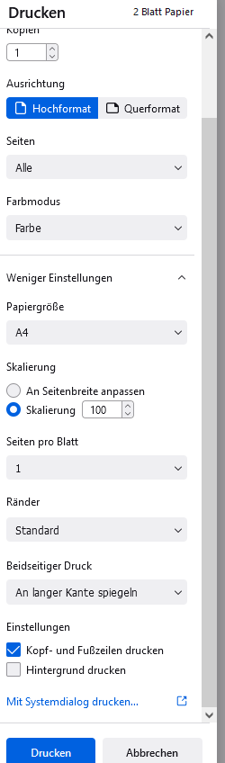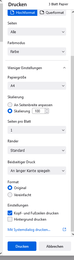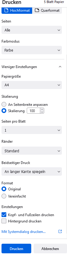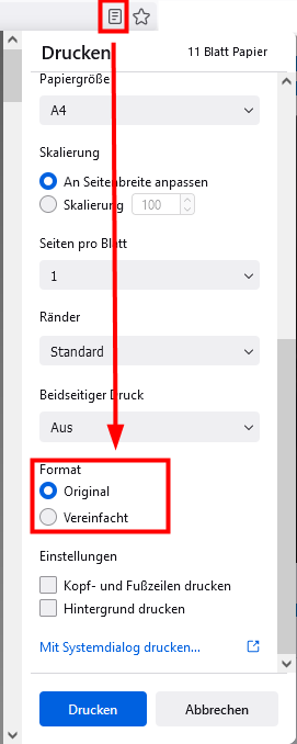 Hinweis: In den Druckeinstellungen einer Webseite ist die Option Format nicht vorhanden, wenn dafür keine vereinfachte Version verfügbar ist oder vor dem Drucken die Leseansicht aktiviert war.Keine Leseansicht möglich -> kein vereinfachtes Drucken.