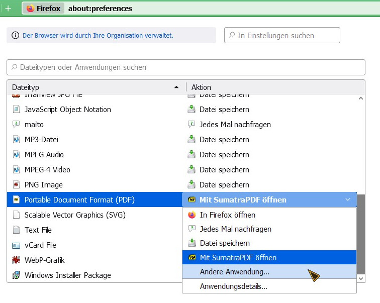Sie funktionieren auch nicht mehr alle richtig. Bei dem PDF hab ich z.B. immer ausgewählt, dass Firefox immer nachfragen soll was ich will. Er fragt ganz normal nach. Will ich dann aber das PDF nur öffnen, öffnet er es zwar, speichert aber das PDF im Download Ordner ab. Was so nicht gewollt ist und was er früher nie getan hatte. Da landeten die PDFs im "Temp" Ordner von Windows...