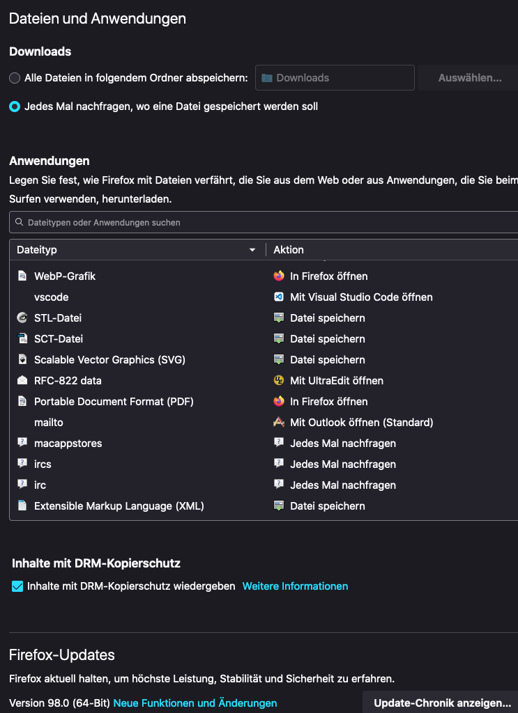 Firefox 98 kein neuer Eintrag in die Liste der Anwendungen möglich