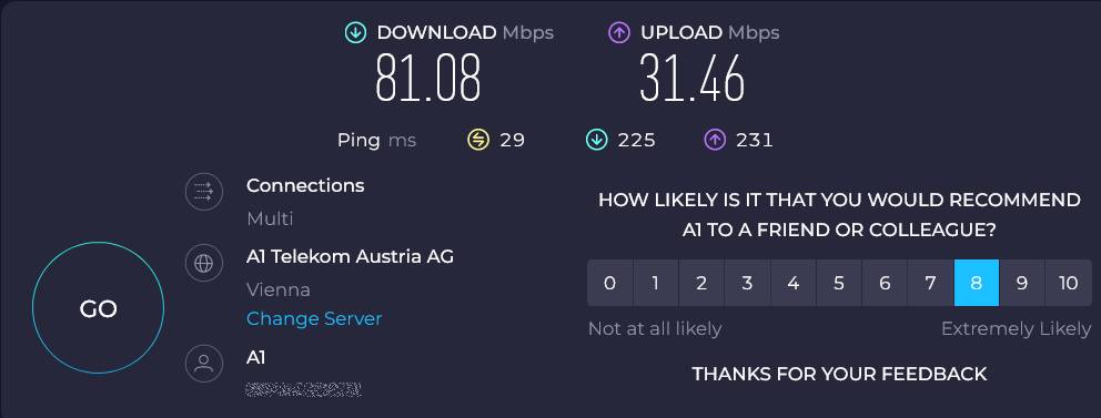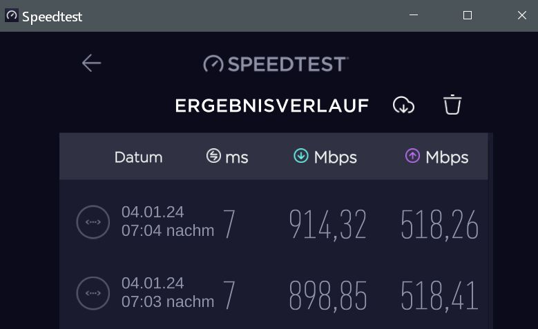 • Ja, ich hatte bereits darüber nachgedacht ob sich bei dem Anschluss die Investition in eine 2,5GB-Karte von Intel lohnt. Am Router direkt kommen nämlich laut Messung bis zu 1150 an, und ja - die Fritzbox ist an einem Lanport mit 2,5Gbit angebunden :)