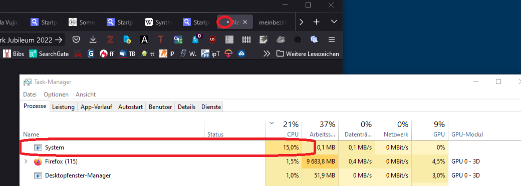 Was ich bemerke ist, dass das System bei 15% steht. und der graue Punkt des neuen Fensters pendelt ständig hin und her.