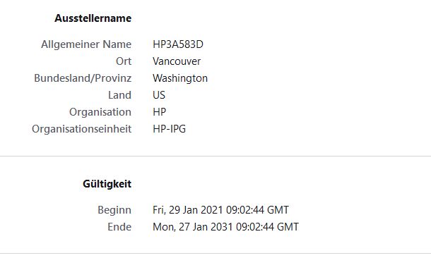 Hallo Zusammen, Wochenlang konnte ich auf eine Adresse im Wlan zugreifen (Druckerserver meines HP Drucker) und jetzt kommt die obige Fehlermeldung. Alle Cache und sonstige Daten löschen bringen keine Besserung! Beim letzen mal habe ich eine Neuinstallation gemacht dann kam eine Erweitert Meldung und es ging wieder. Im Edge funktioniert es einwandfrei und bis gestern auch im Firefox!? Ohne Sicherheit geht es auch nur dann verweigert mir der Drucker Zugriff auf bestimmte Protokolle!