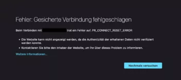 Für die Arbeit muss ich eine bestimmte Seite aufrufen, die gestern noch reibungslos funktioniert hat. Die URL selbst kann ich hier nicht preisgeben, es ist aber eine https://-Seite. Immer, wenn ich diese aufrufen will, erscheint folgender Fehler (siehe Screenshot).