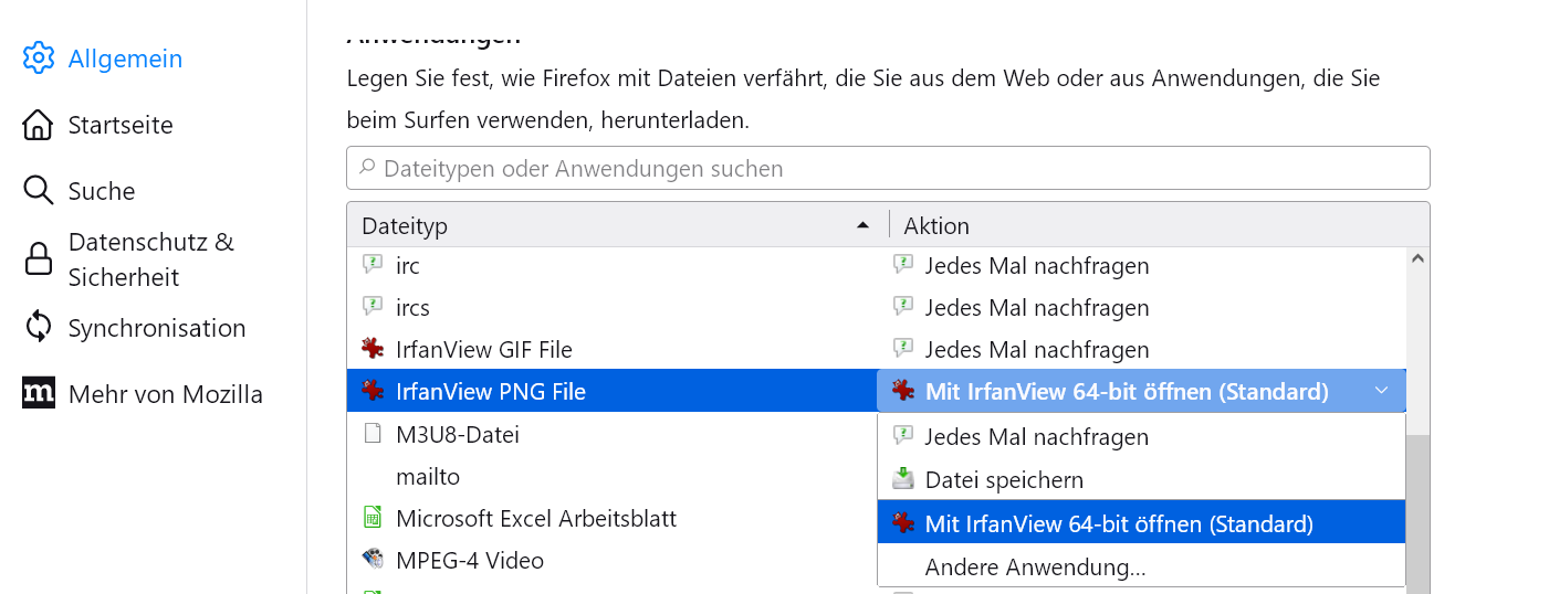 Hallo! Seit kurzem habe ich Probleme mit Downloads. Beim Einsehen von Bilddateien, spezifisch .jpg und .png, auf bspw. Absence werden die Downloads der Bilder automatisch gestartet obwohl in den Einstellungen "Jedes mal nachfragen" ausgewählt wurde. Auf anderen Rechnern war das Problem mit gleicher Firefox Version auch nicht replizierbar und die Downloads haben wie gewohnt nach Abfrage funktioniert.
