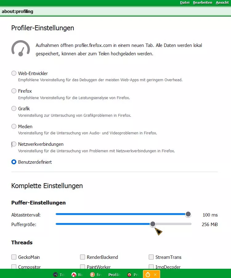 Sorry, aber der Tipp ist wirklich Quatsch ;). Die von dir genannten Einstellungen unter 'about:profiling' haben ausschließlich Auswirkungen auf den internen 'Profiler' von Firefox und auch nur dann, wenn du ihn startest. Der 'Profiler' ist ein Analyse-Tool für Entwickler um Performance-, Speicher- oder Netzwerkprobleme u.v.a. zu analysieren. Er verändert keinerlei Daten oder Voreinstellungen des Firefox dauerhaft. Das Tool ist nützlich, um z.B. herauszufinden, in welchen Threads die meiste Zeit verbraten wird und um dann solche Flaschenhälse zu optimieren. Möglich, dass einem Entwickler nach einem Profilerlauf hier wichtige Werte für die Ursachenanalyse von Performance-Problemen geliefert werden, aber ich vermute mal, der TE wird ganz sicher wenig damit anfangen können...