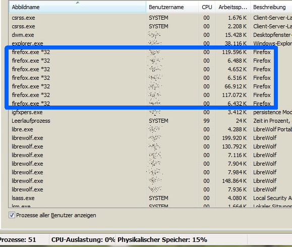 • BTW: Auch auf meinem alten 64-bit-Windows laufen (portable) 32-bit Firefoxe etwas flüssiger. Nach dem Start sind scheinbar mindestens 7 Prozesse nun Standard.