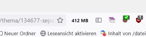 10 statt 60, Vielleicht liegt es daran. Teste mal meine Version:JavaScript Alles anzeigen// ==UserScript== // @name MemoryUsage.uc.js // @namespace http://space.geocities.yahoo.co.jp/gl/alice0775 // @description Memory Usage resident memory in MB // @include main // @charset UTF-8 // @author Alice0775 // @compatibility 99+ // @version 2022/03/31 23:00 Clicking on the button minimizes memory and updates the usage display. // @version 2021/09/18 20:00 no longer available resident-unique from MRM due to Bug 1665318. so use commit size instead of resident-unique size // @version 2021/09/18 20:00 missing MRM // @version 2021/06/17 22:00 use ChromeUtils.requestProcInfo // @version 2021/06/17 19:00 // @version 2021/06/15 // ==/UserScript== var ucjsMemoryUsage = { INTERVAL: 10, //Abstand in Sekunden MRM : Components.classes['@mozilla.org/memory-reporter-manager;1'] .getService(Components.interfaces.nsIMemoryReporterManager), init: function() { try { CustomizableUI.createWidget({ id: 'memoryUsageButton', type: 'custom', onBuild: function(aDocument) { let toolbaritem = aDocument.createXULElement('toolbarbutton'); let props = { id: 'memoryUsageButton', class: 'toolbarbutton-1 chromeclass-toolbar-additional', label: 'MemoryUsage', tooltiptext: 'Speicher Belegung minimieren', onclick: 'ucjsMemoryUsage.MRM.minimizeMemoryUsage(()=>{});ucjsMemoryUsage.requestMemory()' }; for (let p in props) toolbaritem.setAttribute(p, props[p]); return toolbaritem; } }); } catch(e) {} style = `#memoryUsageButton .toolbarbutton-text { display: inline-block !important; font-weight: bold !important; font-size: 13px !important; } #memoryUsageButton .toolbarbutton-icon { display: none !important; }` let sss = Cc['@mozilla.org/content/style-sheet-service;1'].getService(Ci.nsIStyleSheetService); let uri = makeURI('data:text/css;charset=UTF=8,' + encodeURIComponent(style)); if(!sss.sheetRegistered(uri, sss.AUTHOR_SHEET)) sss.loadAndRegisterSheet(uri, sss.AUTHOR_SHEET); window.addEventListener("unload", this, false); window.setInterval(this.requestMemory, this.INTERVAL * 1000); this.requestMemory(); }, uninit: function() { window.removeEventListener("unload", this, false); }, requestMemory: async function() { let winTop = Services.wm.getMostRecentWindow("navigator:browser"); if (winTop == window) { let total =0; const regex = new RegExp("^resident-unique$"); const handleReport = (aProcess, aPath, aKind, aUnits, aAmount) => { if(regex.test(aPath)) { //Services.console.logStringMessage("aPath " + aPath); total += aAmount; } }; await new Promise((r) => { ucjsMemoryUsage.MRM .getReports(handleReport, null, r, null, false); } ); //Services.console.logStringMessage("total " + txt); let txt = Math.ceil(total/1024/1024); for (let win of Services.wm.getEnumerator("navigator:browser")) { if (win.closed || !win.gBrowser) { continue; } let btn = win.document.getElementById("memoryUsageButton"); if (btn) btn.setAttribute("label", txt + " MB"); } } }, handleEvent: function(event) { switch (event.type) { case "unload": this.uninit(); break; } } } ucjsMemoryUsage.init();Mfg.