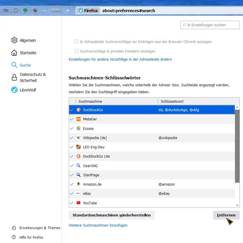 Mein Tipp: Ich würde die nicht benötigten Suchmaschinen in den Einstellungen ganz entfernen,
