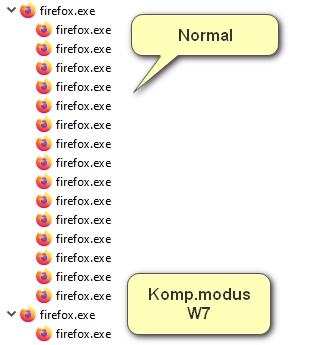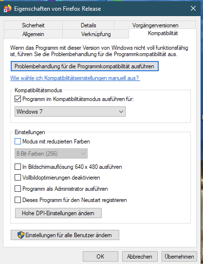 • Ich weiß nicht, was dieser Kompatibilitätsmodus alles verändert. Der Modus ist ja eigentlich nur für Uraltprogramme gedacht, die eben nicht mehr mit höheren Windows-Versionen kompatibel sind, weil sie spezielle Funktionen verwenden bzw. voraussetzen. Ich sehe das eher nicht als Firefox-Problem an... :/
