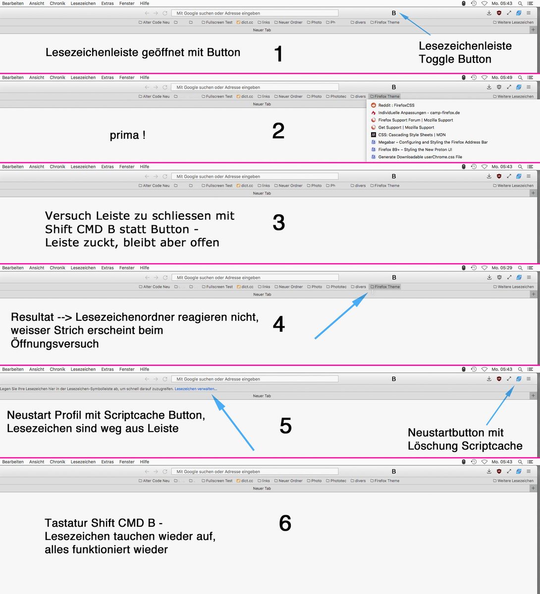 Aber das Problem mit den nicht reagierenden Lesezeichenordnern taucht trotzdem weiterhin auf, wenn man zwischen Tastaturkürzel bzw. Kontextmenü , und dem Button hin-und herwechselt zum Einblenden der Leiste .