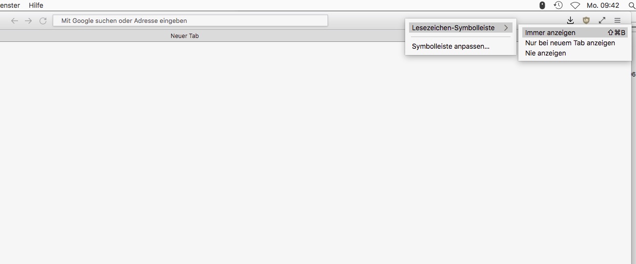 Allerdings setzt - zumindest bei mir auf dem Mac - das Tastaturkürzel bzw. die Kontextmenüfunktion zum Verstecken der Lesezeichenleiste die generelle Lesezeichen Symbolleiste Einstellung auf anzeigen/nicht anzeigen , mit oder ohne Script .