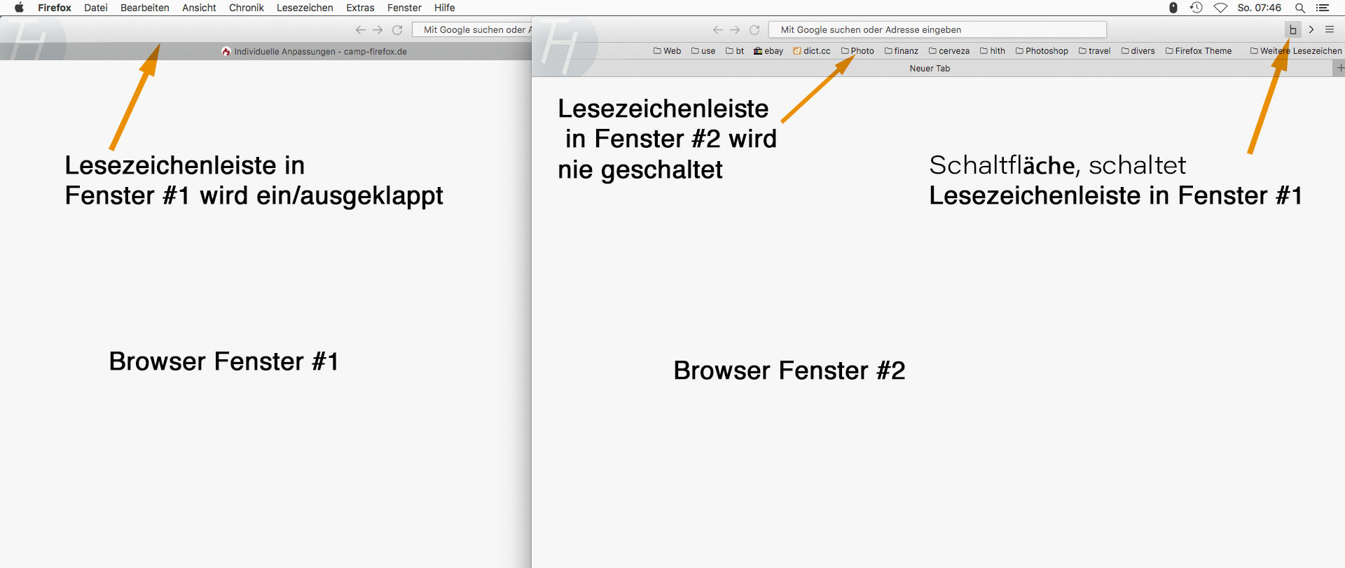Wenn ich ein oder mehr zusätzliche Fenster öffne , schaltet der Button in der Toolbar eines neuen Fensters die Lesezeichenleiste des orginalen ersten Fensters, und nicht die Lesezeichenleiste im neuen Fenster .