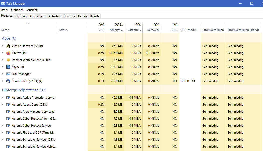 besteht dann denn ein Problem? Wie sieht das im laufenden Betrieb aus, wenn Du das Problem hast? Hier sind es gerade 88 Hintergrund- bzw. 100 Windowsprozesse. Der Fx belegt aktuell 1,5 von 32GB mit 7 offenen Tabs. Wie viele Apps laufen (hier aktuell 7)?