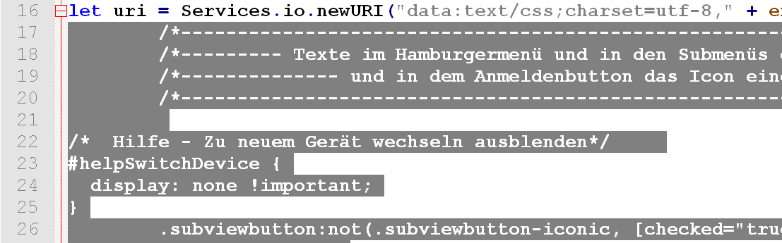 Im Beispiel aus Beitrag #50 gibt es überhaupt keinen Syntax-Unterschied, der generell mit dem Unterschied zwischen CSS in einer CSS-Datei und CSS in einer JS-Datei zu tun hat. Mira_Belle hat in der Script-Variante die Gelegenheit genutzt, um den Pfad in eine Variable auszulagern, so dass sie den Pfad, sollte sich dieser ändern, nur ein einziges Mal statt n Mal ändern muss. CSS selbst unterstützt keine sogenannte Konkatenation mit einer Variablen. Aber lässt du das weg, ist die Schreibweise des CSS-Teils komplett identisch.